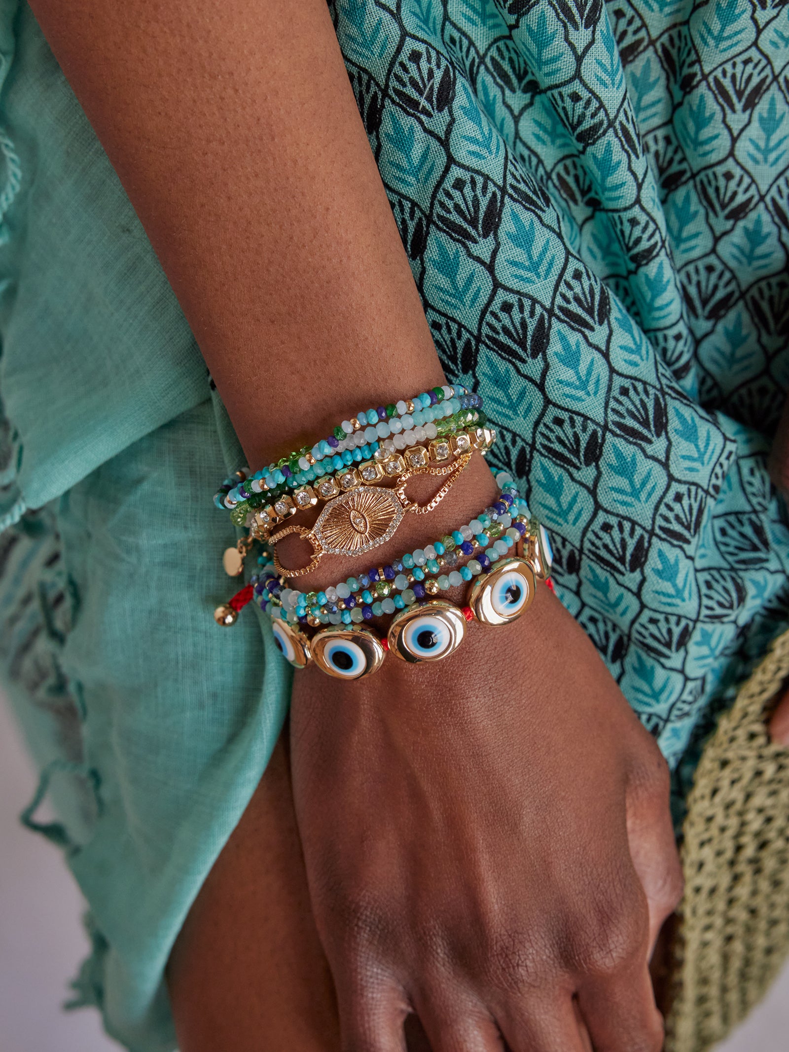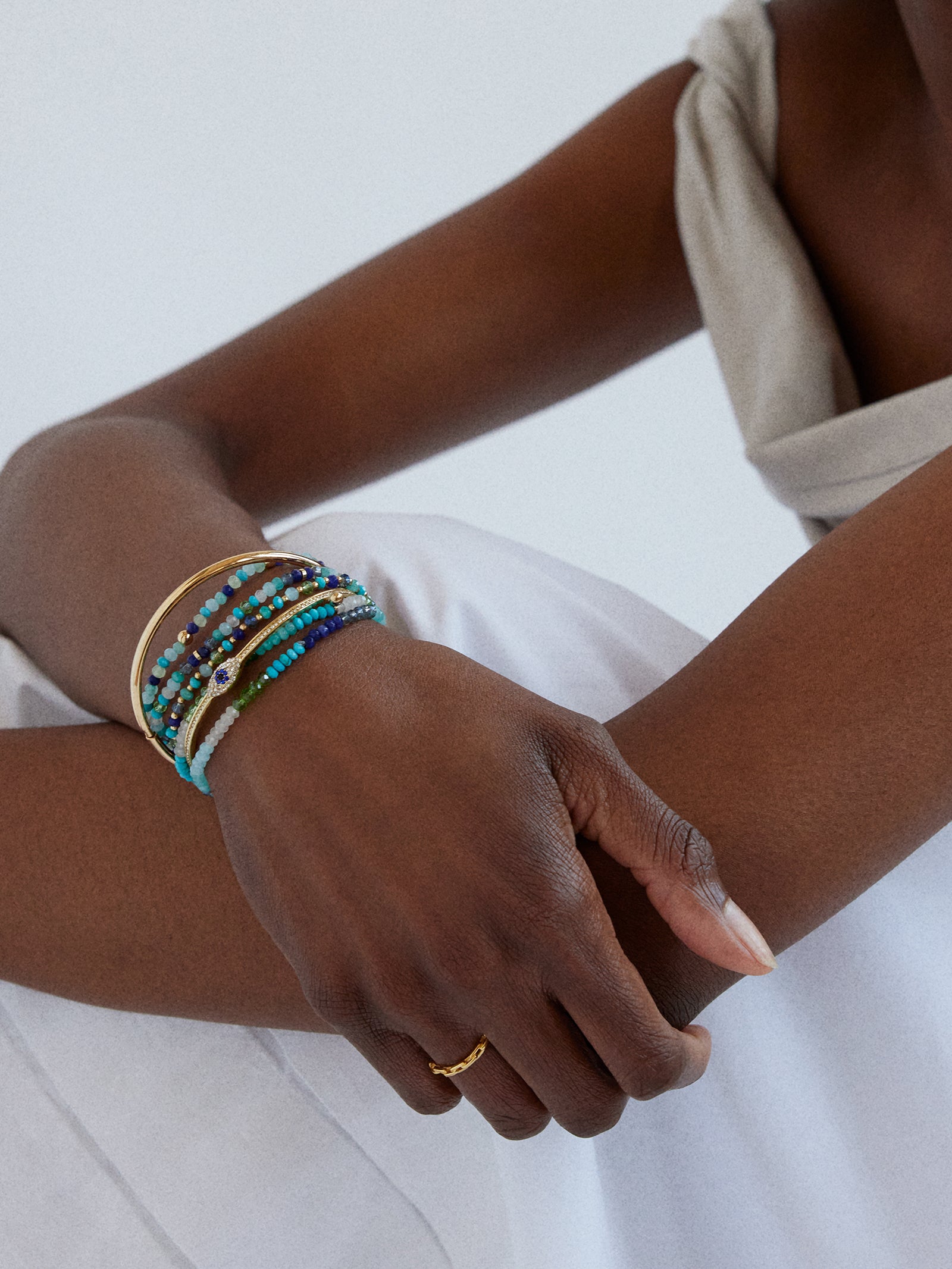 Create an automatic wriststack with five beaded bracelets. each adorned with meaningful semi-precious stones in a mix of cool-toned shades.