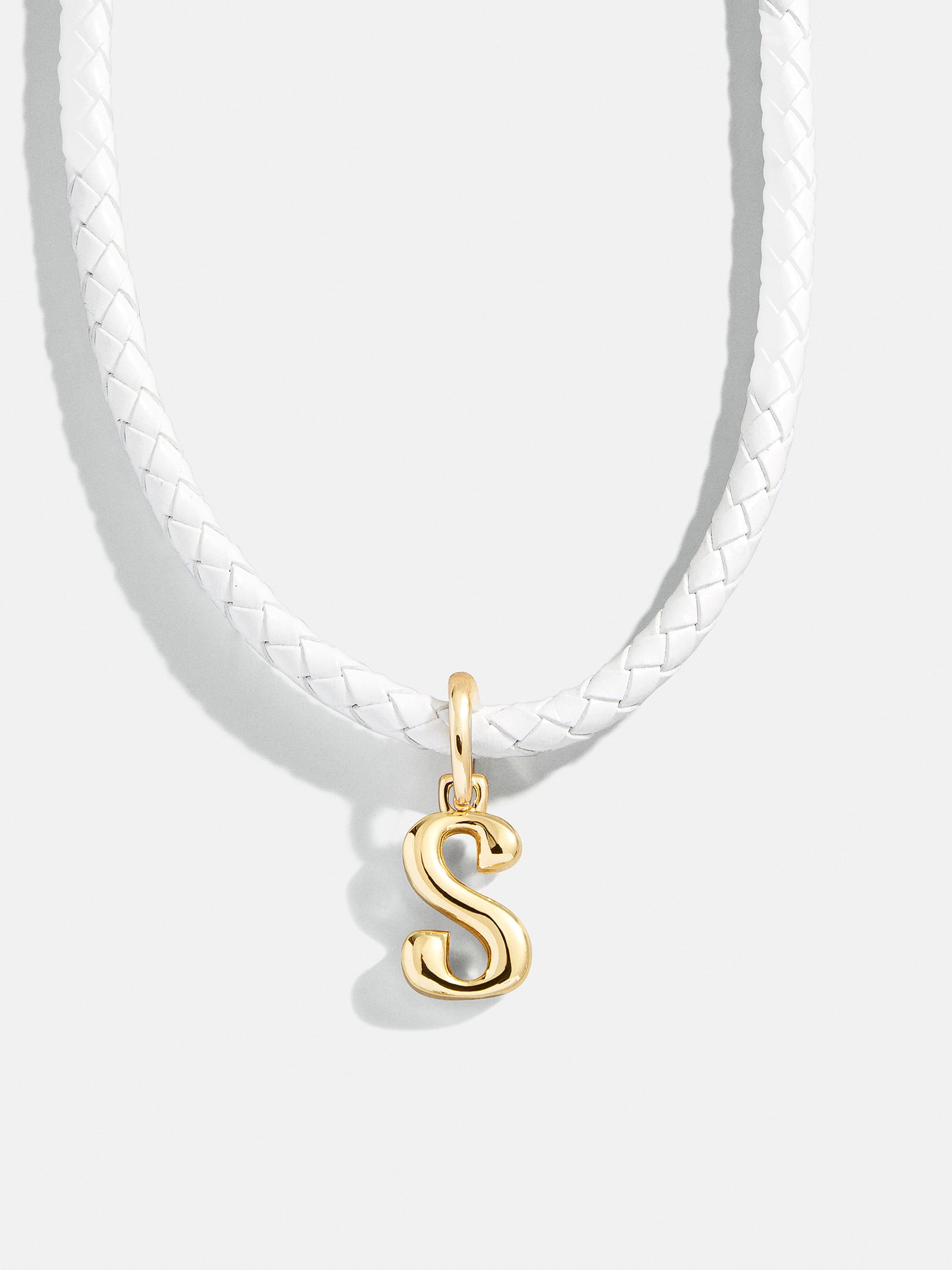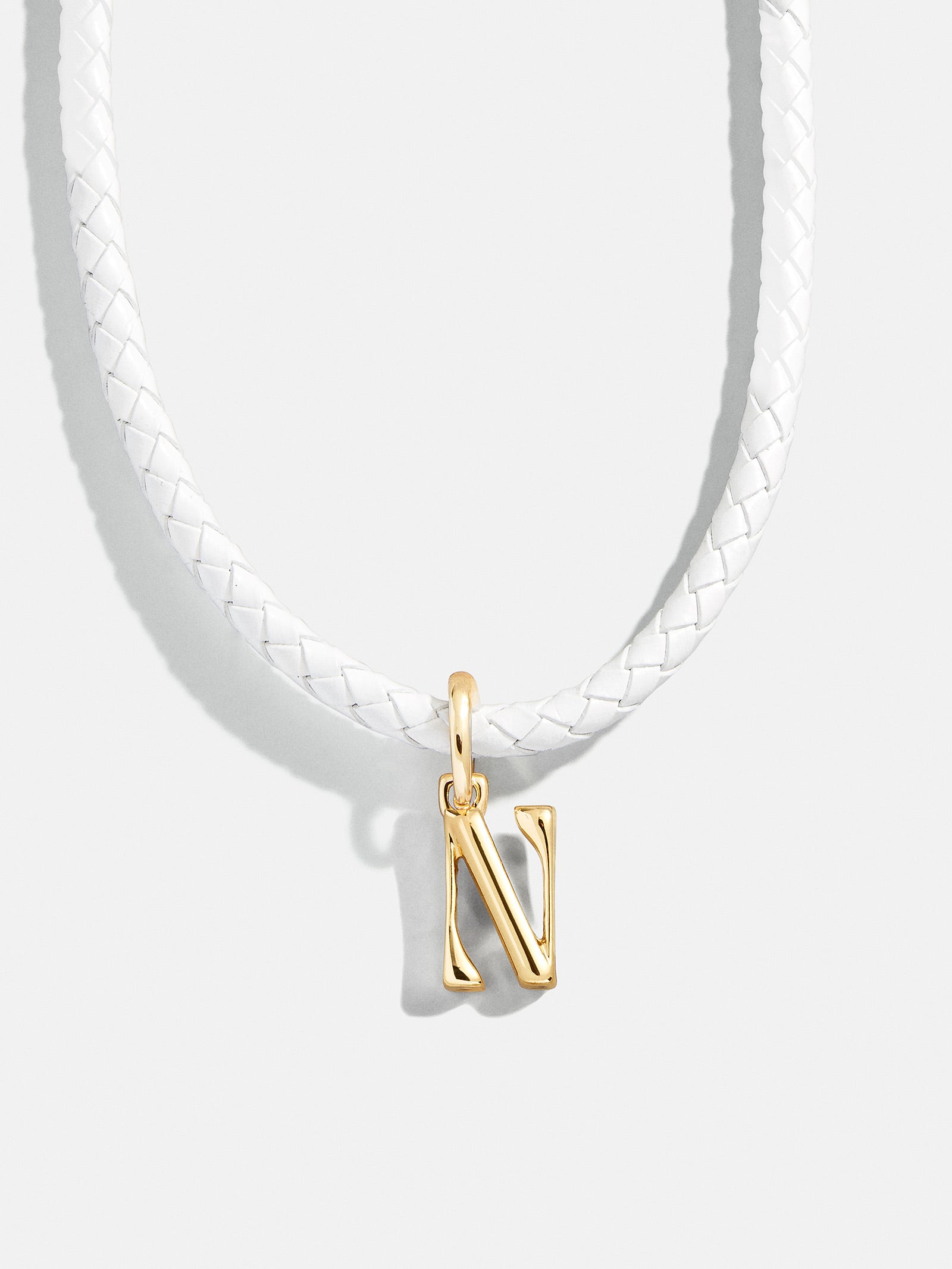 Minimalist. modern. and made just for you ?? the Leather Custom Initial Necklace adds a personal touch to your everyday look. Designed with the gold initial of your choice on a white leather cord. it’s effortlessly cool no matter how you style it.