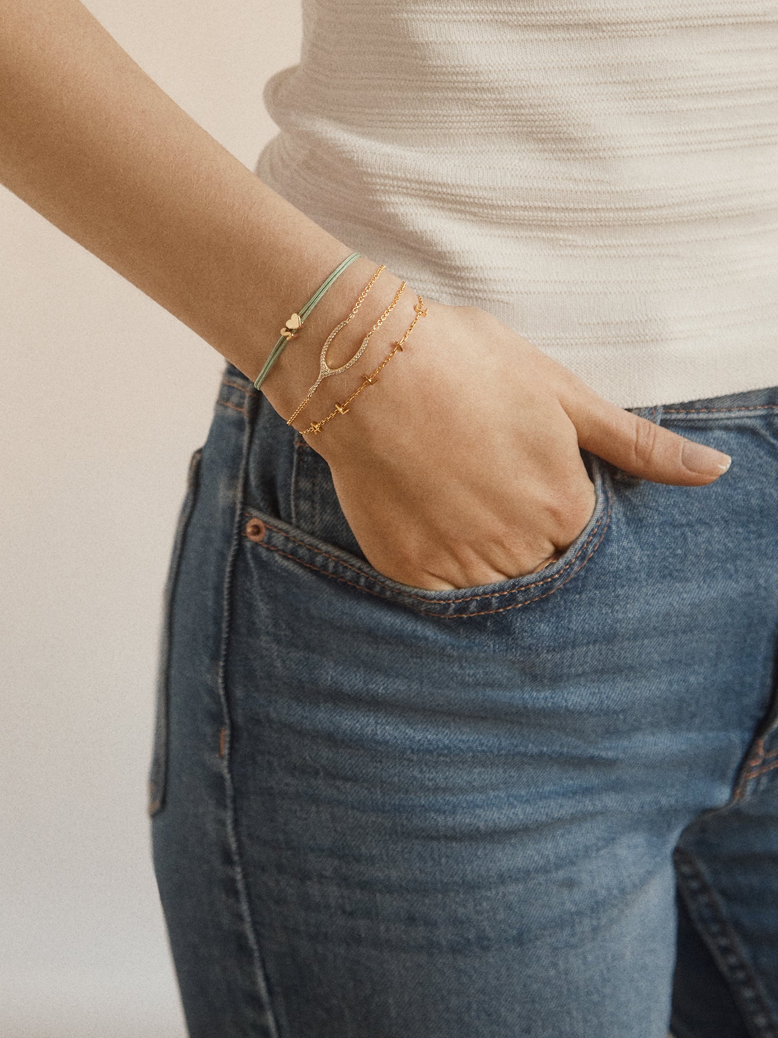 Stay lucky in the chicest fashion. Featuring a delicate pav?? wishbone on a dainty gold chain. this bracelet adds just the right touch of sparkle and meaning to your wrist stack. Crafted from 18K Gold and cubic zirconia stones. it’s designed for everyday elegance and timeless wear.