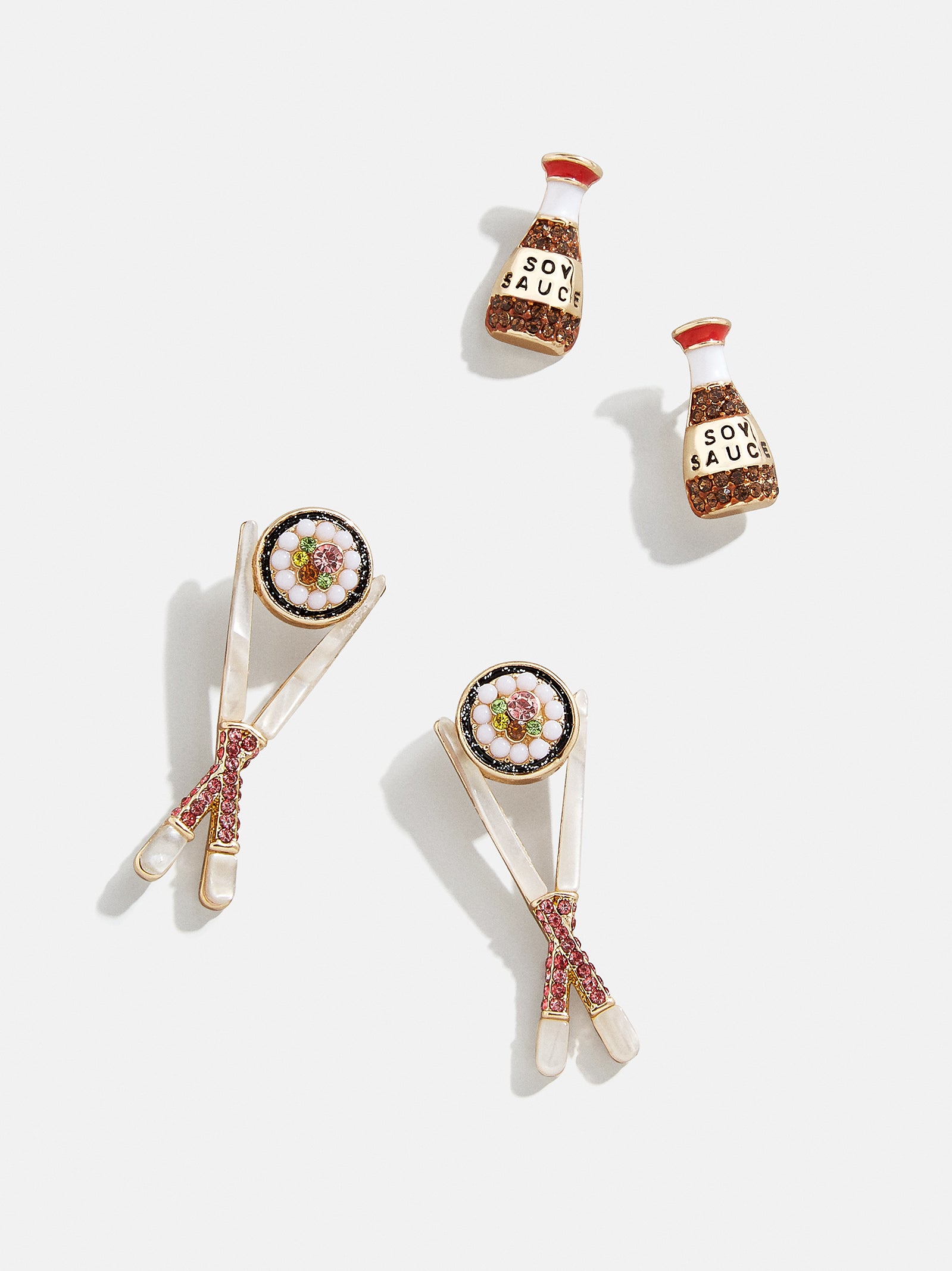 Show off your sushi love with the Soy Cute Earring Set. Feeling saucy? Wear the soy sauce statement earrings. Ready to let the good times roll? Apply the statement sushi and chopsticks earrings. Mix and match both pairs to create a feast of an ear stack. Please note this only comes with two sets of earrings. the soy sauce and chopsticks.