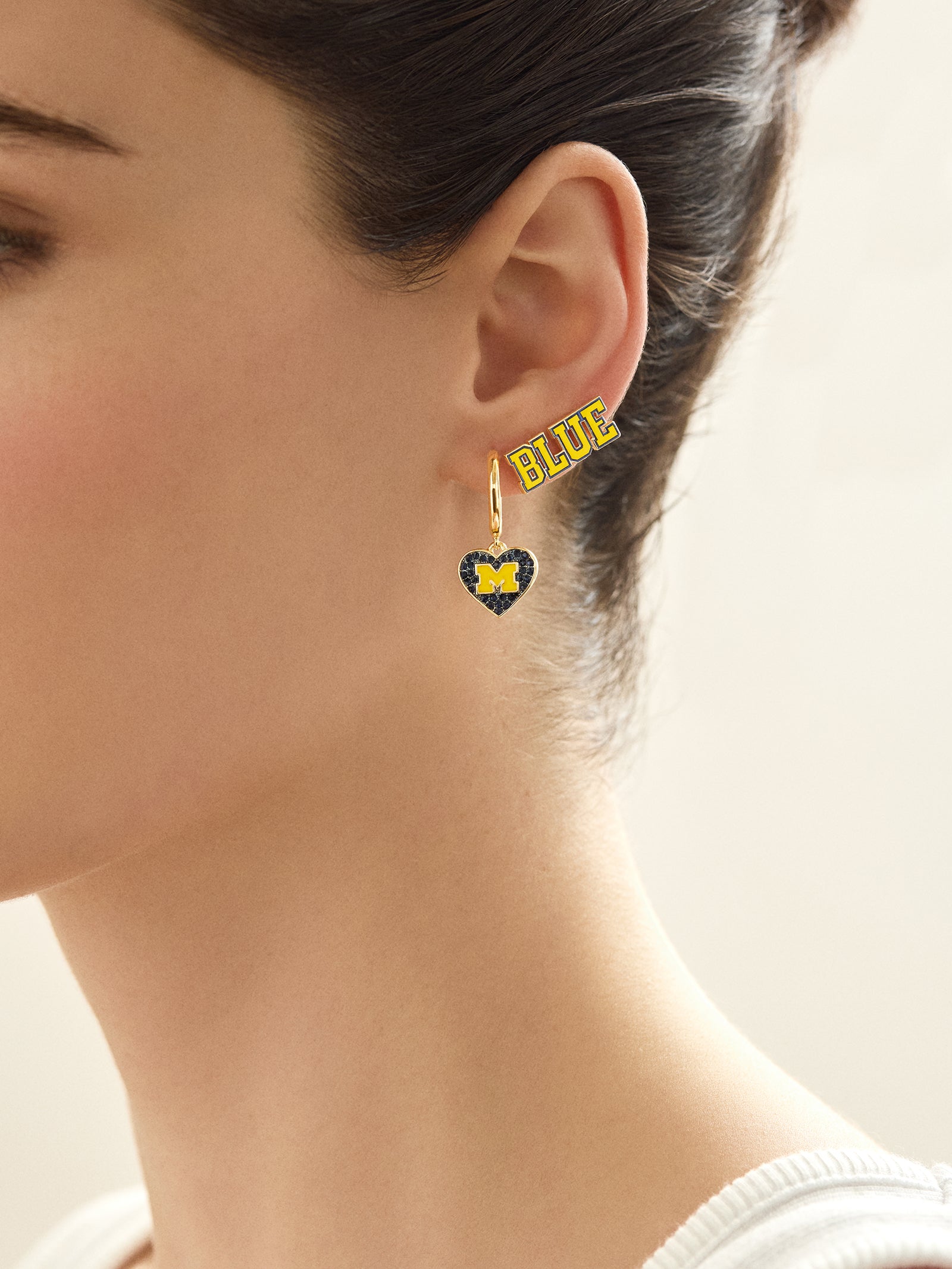 Level up your game-day glam with the University of Michigan Earring Set. This pack includes must-have Go Blue earrings and dangling heart drop earrings. featuring a Michigan M in the center. Mix. match. or even share a pair with a fellow fan ?? the Wolverines never go out of style.